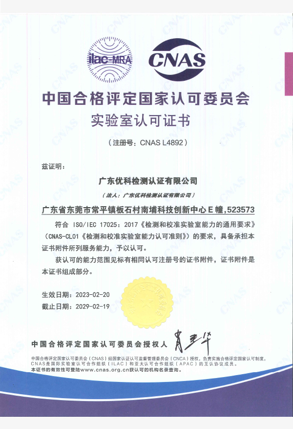 廣東優科檢測認證有限公司(簡稱:UKK)成?于2007年,是國內專業的汽車整車及零部件、電子元器件第三方檢測實驗室,國家級中小企業公共(技術)服務示范平臺,獲得了國家?新技術企業、廣東省專精特新中小企業、市級工程技術研發中心等榮譽稱號。 More